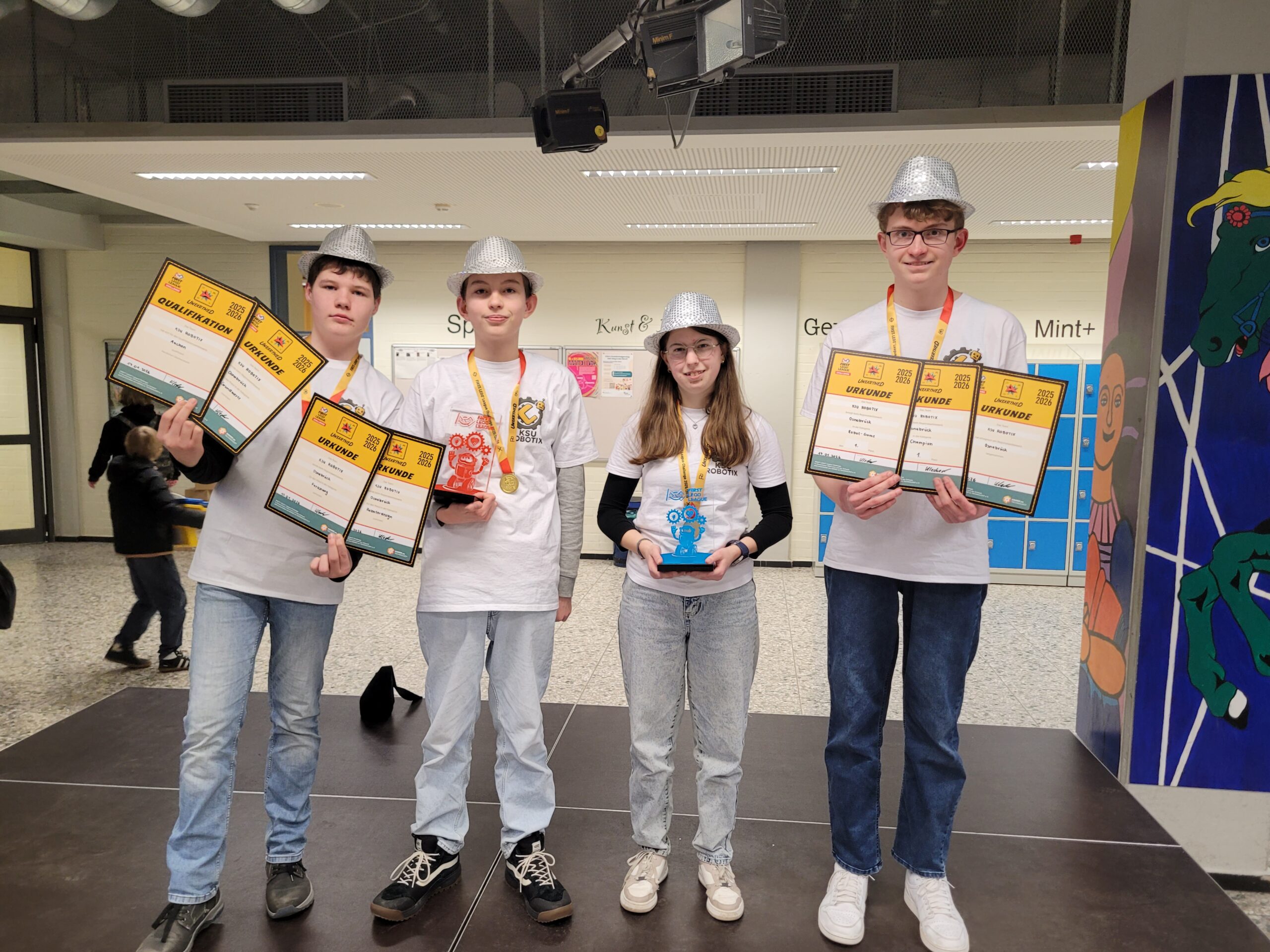 Das Team KSU ROBOTIX hat am Samstag, 17. Januar 2026 beim Wettbewerb „FIRST LEGO League Challenge“ in Osnabrück den Champion-Pokal gewonnen! Neben dem Gesamtsieg konnten die vier Teammitglieder Amira, Pelle, German und Jonne auch den 1. Platz im Robot-Game holen und den begehrten Pokal gewinnen.