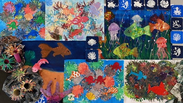 Bunte Unterwasserwelt: Gemeinschaftskollage aus der Kunstschul-AG