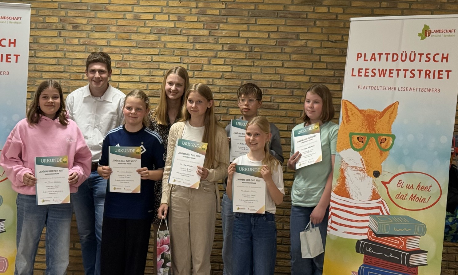 Beim Kreisentscheid des Plattdeutschen Vorlesewettbewerbs in der Waldschule Leschede siegten sowohl Resa Wolters (5d) als auch Mattis Kroner (8a) in ihren jeweiligen Altersgruppen. Insgesamt nahmen 41 Schüler_innen teil. Nun vertreten sie das KSU beim Bezirksentscheid am 13. Mai in Neuenhaus. Wir wünschen viel Erfolg!