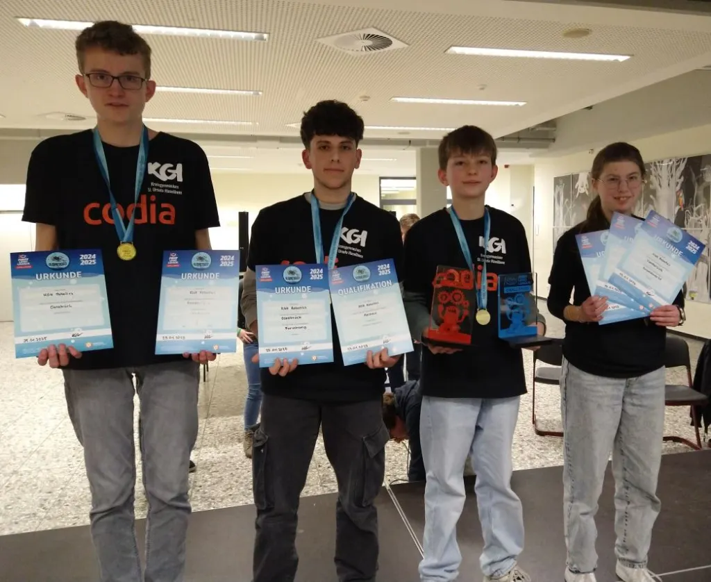 Am 25.01.2025 fand der Regionalwettbewerb in Osnabrück am Gymnasium Carolinum statt. Bereits um 9 Uhr traf das Team bestehend aus Jonne Schulte (Jg. 7), Pelle Schulte (JG 9) Amira Zuchgan (JG 10) und Gregori Bojkovski (JG 11) am Wettbewerbsort ein. Sie wurden von ihrem Coach Stephan Armbrust begleitet. Der Wettbewerb startete direkt nach den Sommerferien und es wurde nicht nur während der AG-Zeiten getüftelt, sondern auch an diversen Wochenenden und in den Herbst- und Weihnachtsferien. Das Team wollte unbedingt eine Runde weiterkommen. Bei der Preisverleihung konnten die Schüler aus Haselünne durchweg überzeugen. Mit dem 1. Platz in der Kategorie Robot Game erhielten sie einen Pokal, im Robot-Design, Forschungspräsentation und Grundwerte wurden sie ebenfalls für die ersten vier Plätze nominiert. Somit war auch der Gesamtsieg inklusive Champion-Pokal ihrer. Die beiden besten Teams vom Regionalwettbewerb Osnabrück werden am 23.02.25 beim Qualifikationswettbewerb in Aachen antreten. Dort treffen sie dann auf die Gewinnerteams anderer Regionalwettbewerbe. Auch hier drückt das KSU die Daumen