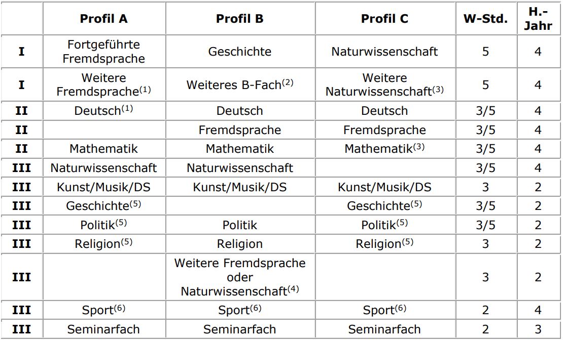 I Schwerpunktfächer, II Kernfächer, III Ergänzungsfächer