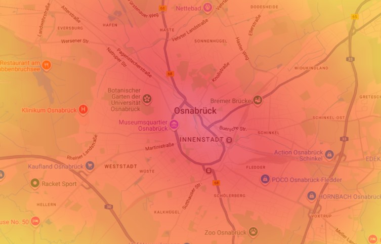 Die Untersuchung steht im Zusammenhang mit Forschungsergebnissen, die zeigen, dass größere Städte und dichter besiedelte Gebiete im Durchschnitt höhere Beleuchtungsstärken aufweisen [1]. Studien gehen davon aus, dass die Helligkeit typischerweise mit zunehmender Entfernung vom Stadtzentrum abnimmt und ein Distance-Decay-Gradient entsteht. Dieses Muster findet sich auch in der Lightpollutionmap (www.lightpollutionmap.info) von Osnabrück wieder: Die innerstädtischen Bereiche strahlen deutlich heller als umliegende Wohn- oder Industriegebiete (siehe nachstehende Abbildung). Die Messung zeigt zudem, dass selbst in kleineren Städten wie Lingen lokale Quellen künstlicher Aufhellung vorhanden sind. Im Vergleich zur Osnabrücker Passage fallen die maximalen Werte jedoch geringer aus.