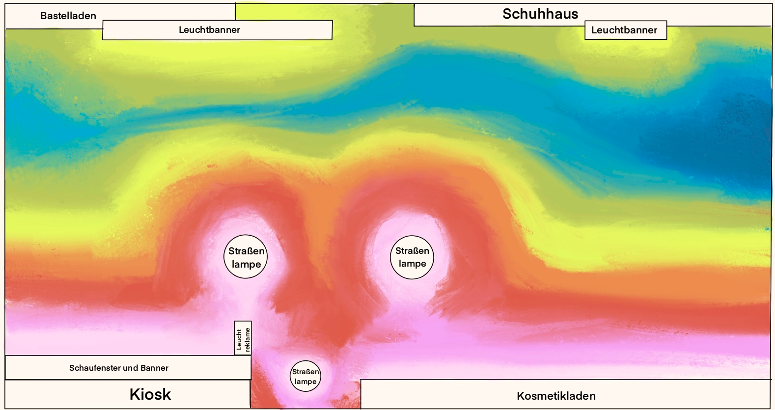 Die ausgeprägten weißen und pinken Bereiche der Beleuchtungskarte zeigen, dass mehrere Lichtquellen sich überlagern und ein durchgehend helles Umfeld erzeugen.