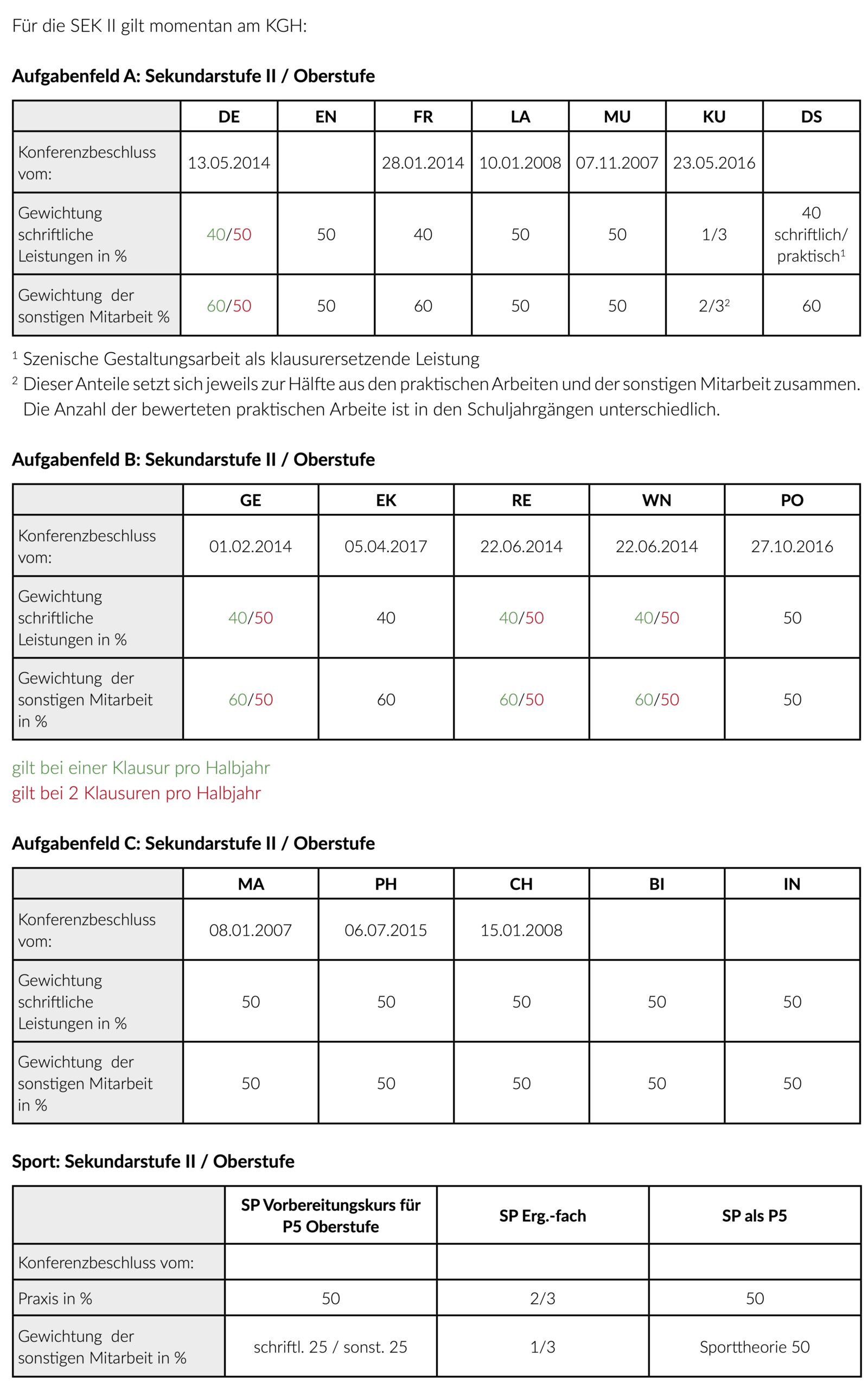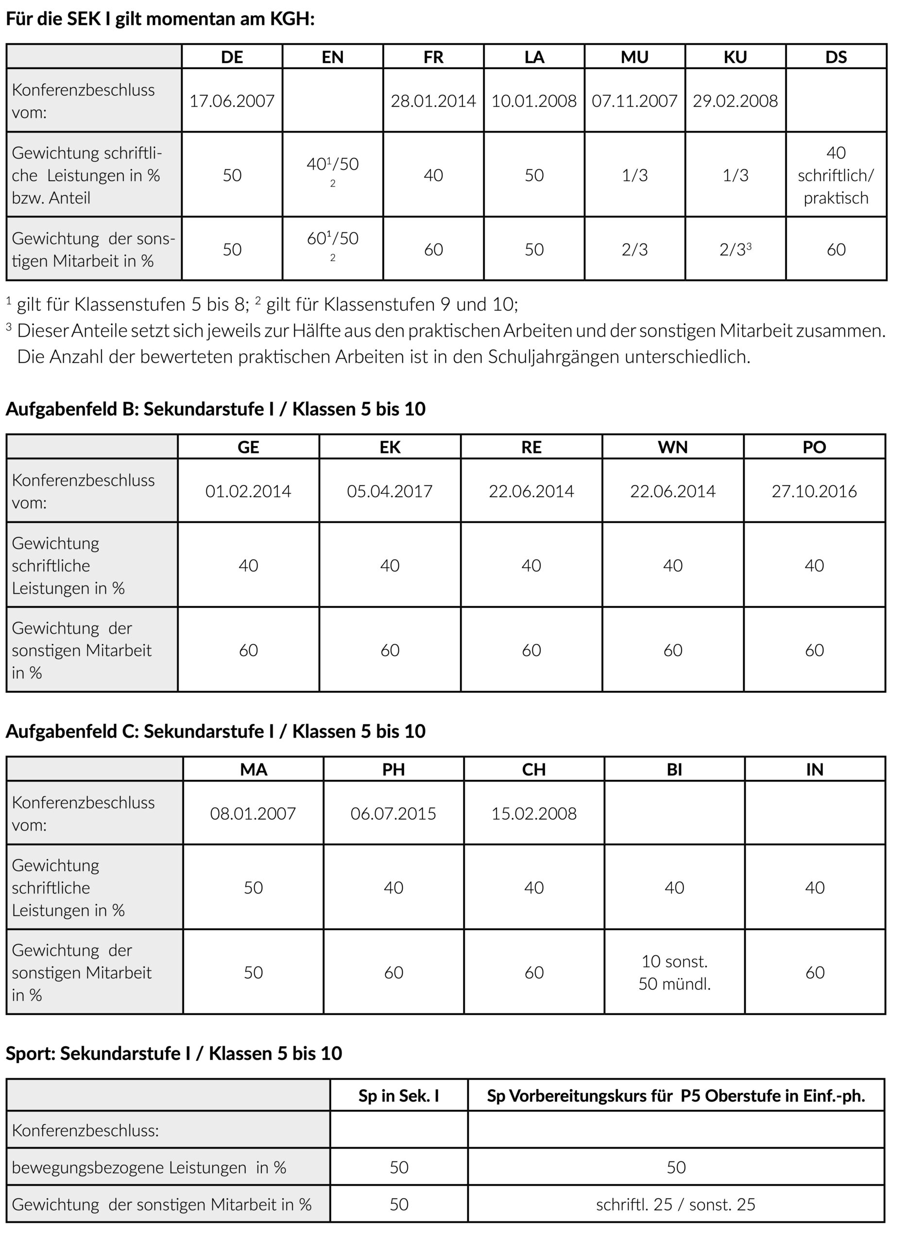 Folgend findet sich eine Übersicht der unterschiedlichen Gewichtungen der Fächer in Bezug auf die schriftlichen Leistungen und die sonstige Mitarbeit.