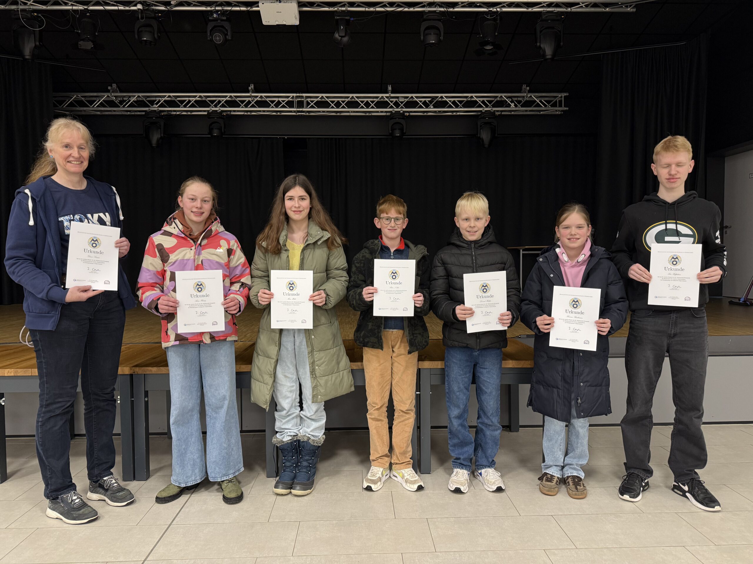 Hermine Brackmann und Dima Smiian (beide Klasse 5), Laurenz Burke, Clemens Fangmeyer, Ferdinand Hegger, Leonard Heitker, Anna Hüring und Anton Nollet (alle Klasse 6), Mara Möller (Klasse 7), Lars Hoffschröer (Jahrgang 12).