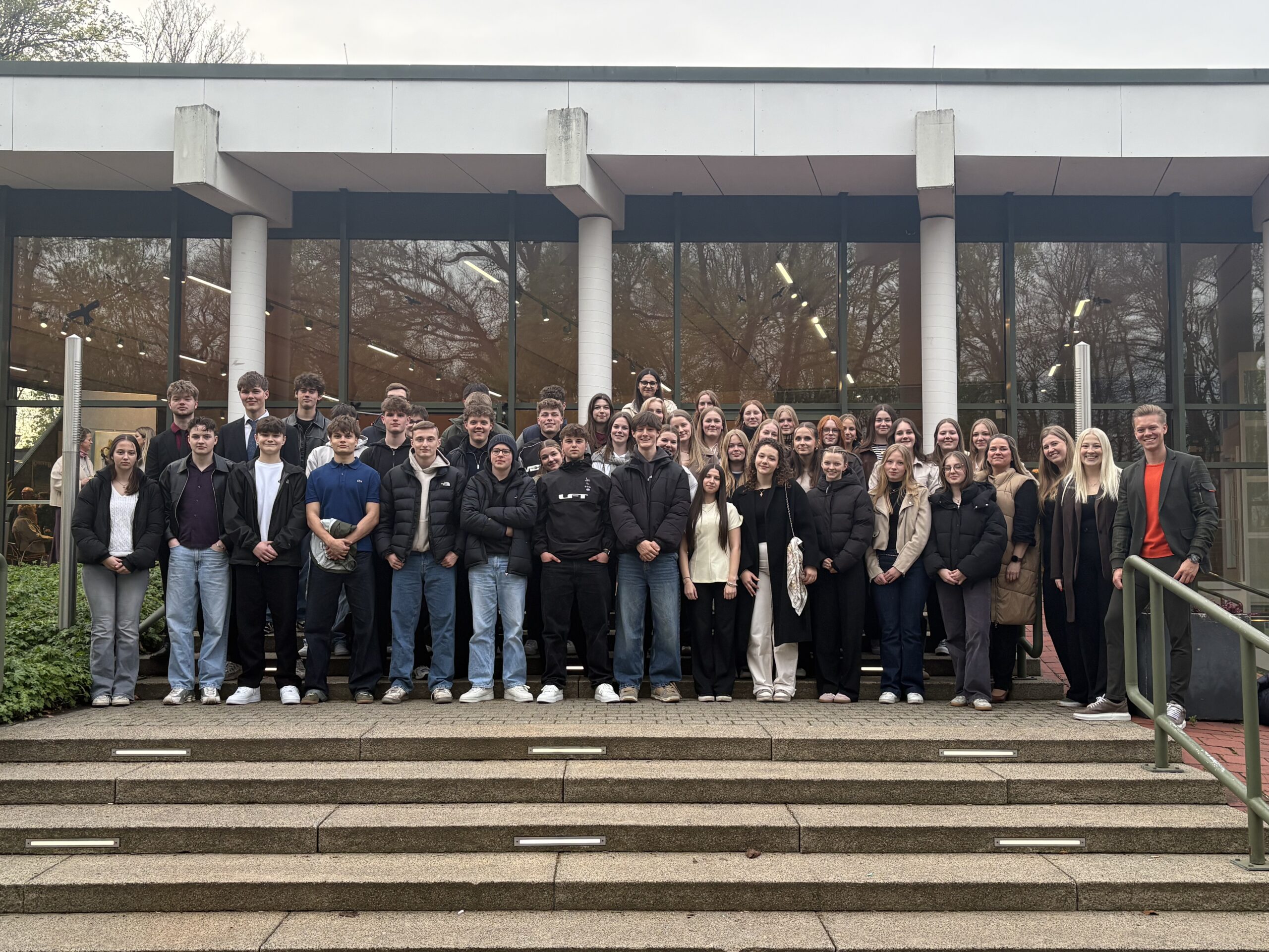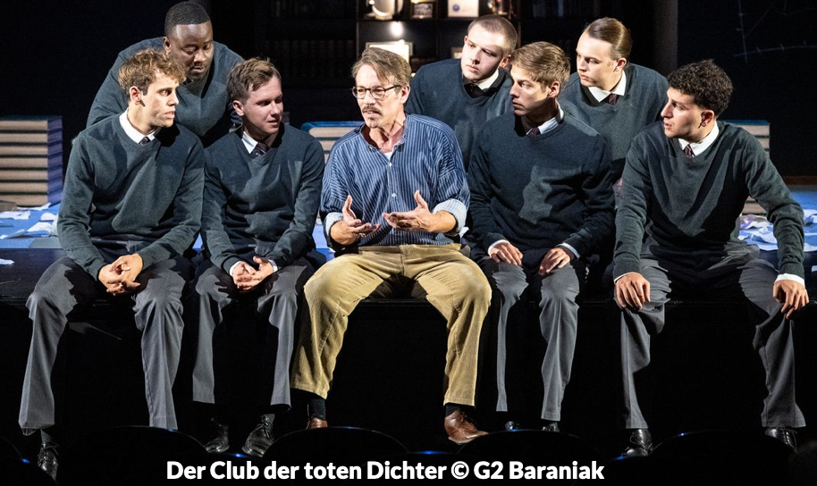 Tradition, Ehre, Disziplin, Exzellenz – und dazwischen ein freigeistiger Literaturlehrer. Wie diese Kombination den Schulalltag, das Leben und besonders das Denken von fünf jungen Männern auf dem Elite-Internat Welton Academy beeinflusst, konnten die Schüler*innen des 11. Jahrgangs am 12.04.2026 im Theater an der Wilhelmshöhe eindrucksvoll miterleben. Durch die eindringliche Inszenierung, die auch auf musikalische Untermalung und besonders körperliches Spiel setze, fühlte das Publikum sich von John Keating selbst angesprochen. Das Bühnenbild, welches szenenweise auf zwei Ebenen aufgeteilt wurde, bot eine symbolträchtige Gestaltung.