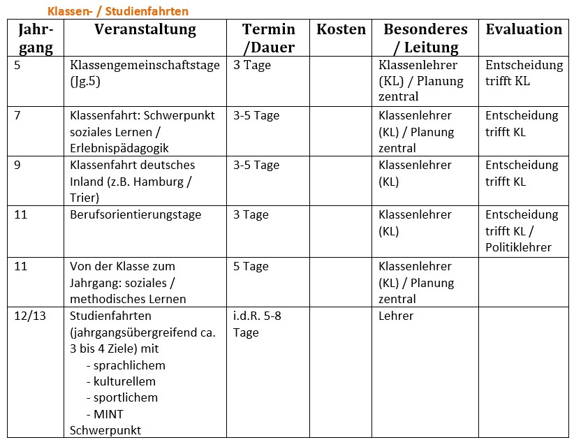 Klassen-, Studien- und Austauschfahrten gehören zu den Höhepunkten eines Schuljahres und sind fester Bestandteil des pädagogischen Gesamtkonzepts am Kreisgymnasium St. Ursula Haselünne. Dennoch stellt die Durchführung einer Fahrt keine Selbstverständlichkeit dar, denn es besteht keine Verpflichtung für Lehrkräfte zur Durchführung von Fahrten. Infolge dessen besteht auch kein Anspruch von Lerngruppen darauf.